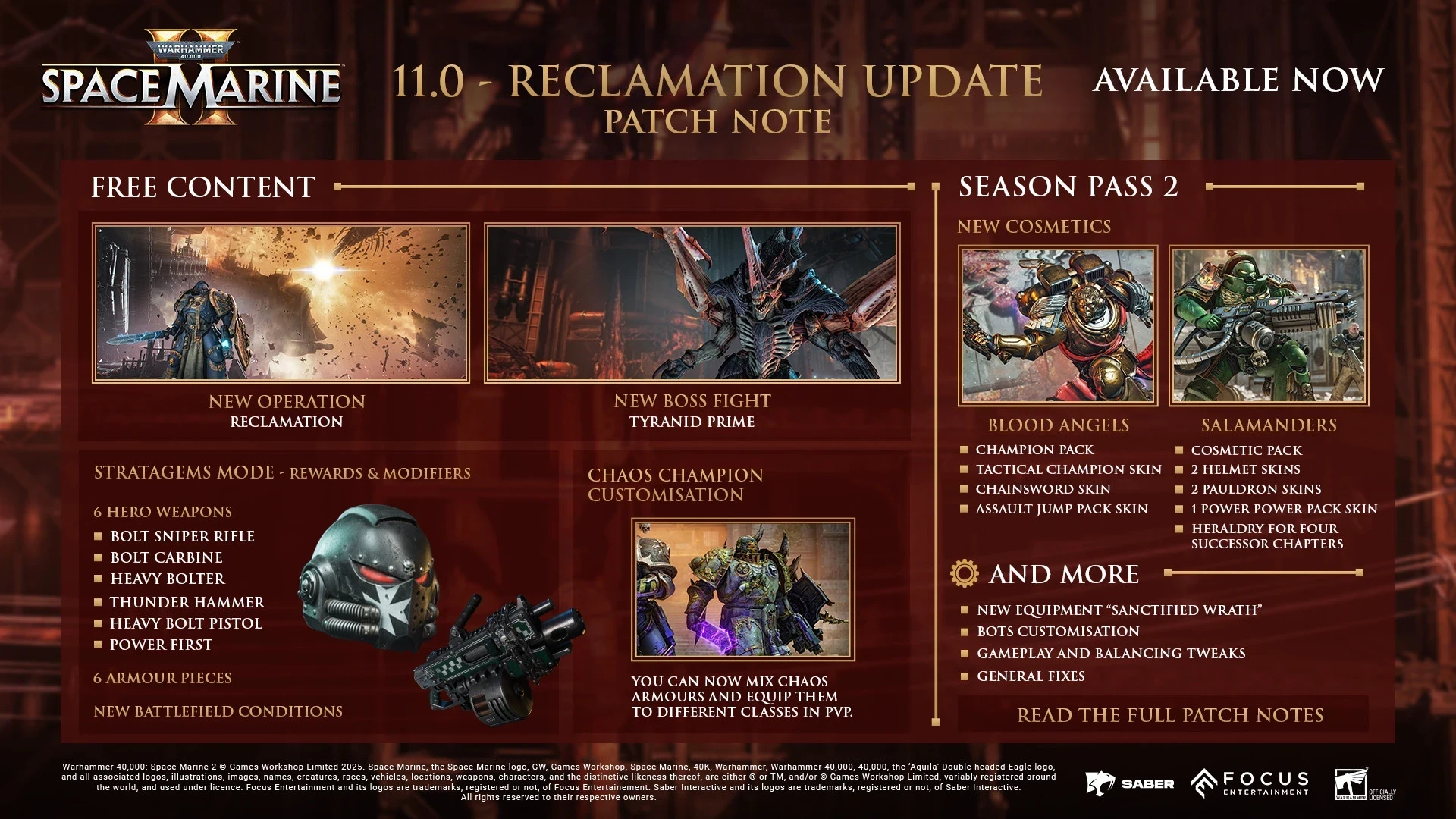 Вместе с этим арсенал пополнился целыми шестью видами героического оружия: это будет и снайперская винтовка, и тяжёлый болтер, и болт-пистолет, и громовой молот. Но особое внимание уделили броне. Речь как о новых элементах наряда космодесантников, так и о полной кастомизации воинов Хаоса. Также в игру добавили наборы Blood Angels (чемпион) и Salamanders (косметика).