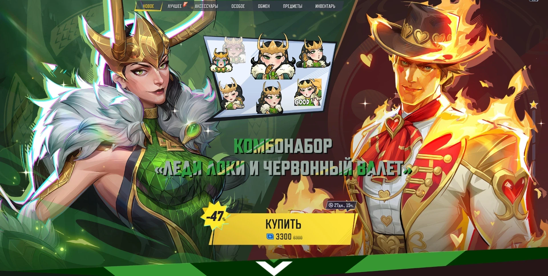 В игре появился обещанный костюм Леди Локи — это женская вариация Локи с уникальной озвучкой. Новинка пробудет в магазине до 30 января, прямо как и Червонный валет — аристократический костюм для Человека-факела со стильной шляпой. Оба наряда продаются со значительной скидкой в комбонаборе. Также в магазине можно урвать набор эмодзи с Леди Локи.