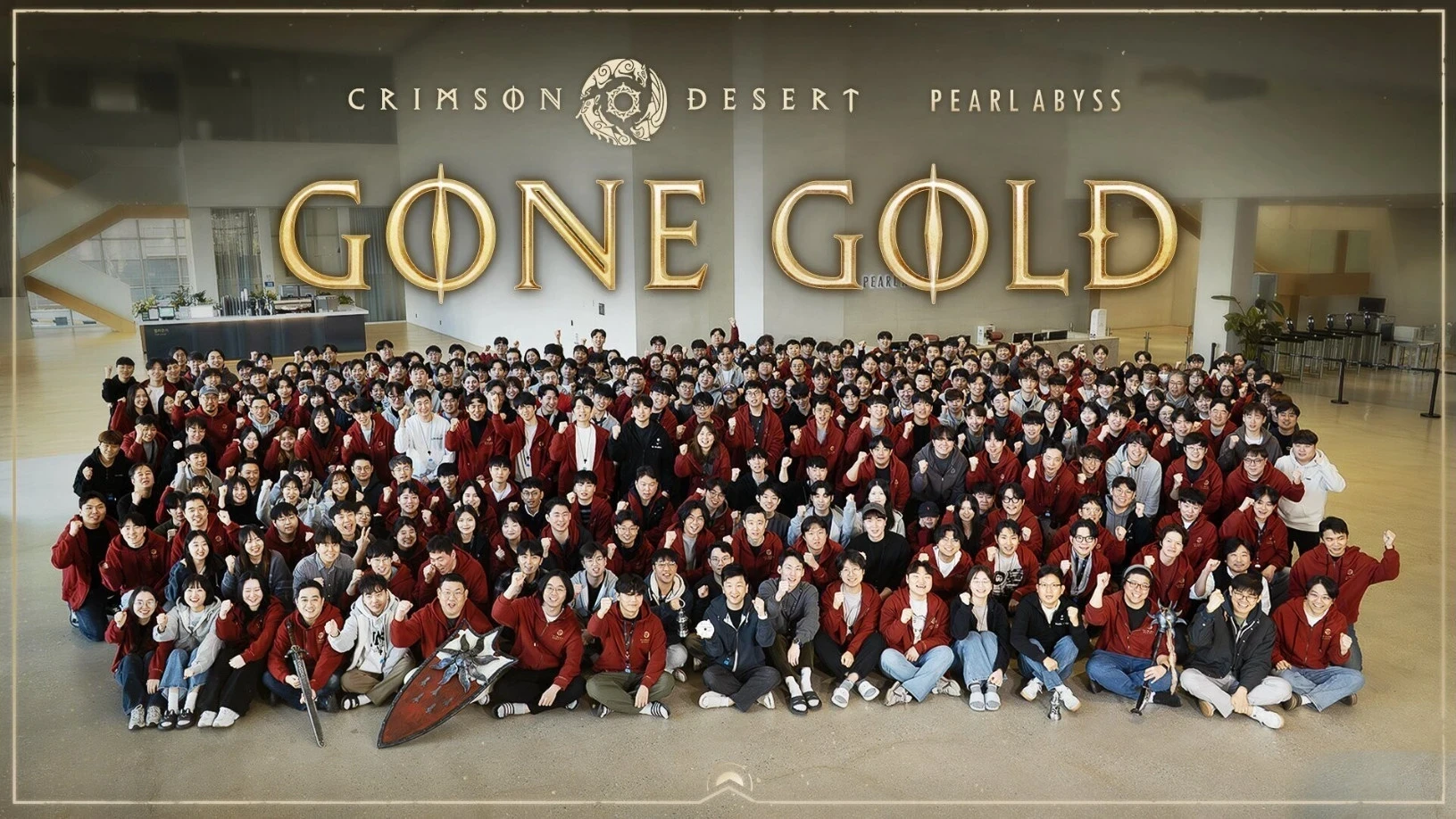 В честь достижения важной вехи в разработке студия поделилась групповой фотографией команды. Множество сотрудников Pearl Abyss, причастных к Crimson Desert, собрались в холле. В центре толпы находится, судя по всему, геймдиректор игры — он держит в руках тот самый «золотой» диск. Именно с него должны будут взять сборку, которая попадёт на диски с экшеном для консолей.