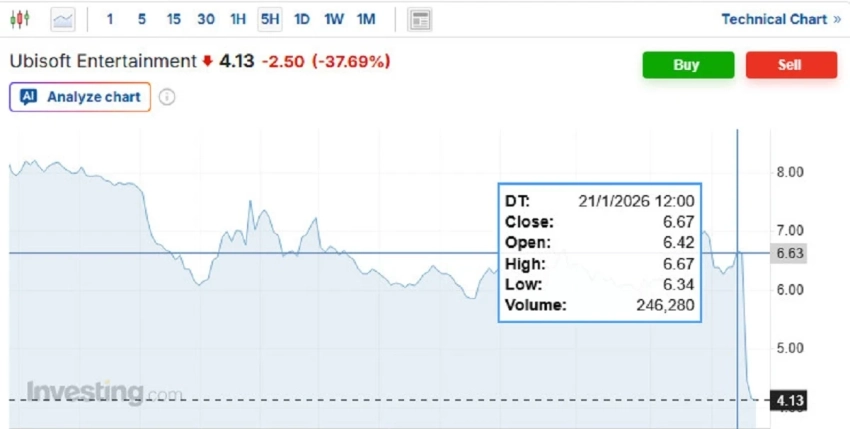 В момент написания новости одна ценная бумага Ubisoft стоит 4,12 евро. При этом ещё вечером 21 января стоимость акции превышала 6 евро. Согласно аналитическим инструментам, инвесторам стоит поскорее задуматься о продаже накопленных активов Ubisoft.