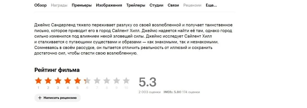 Так, к примеру, на «Кинопоиске» пользовательский рейтинг составил 5,3 балла на основе более 2 тыс оценок. Напомним, что официальная премьера «Возвращения в Сайлент Хилл» в России состоялась вчера.