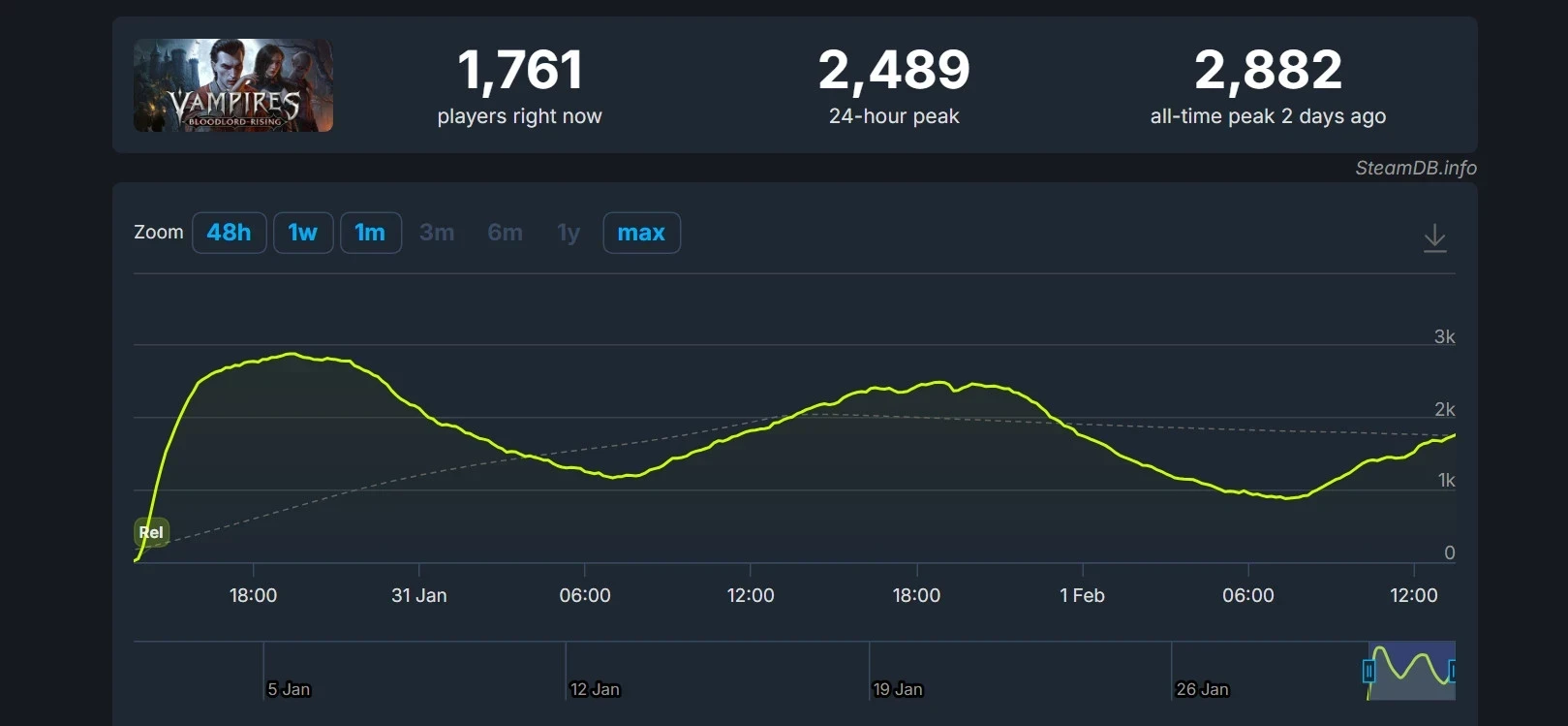Пиковый онлайн Vampires: Bloodlord Rising в Steam превысил 2,8 тыс. человек. Это третий по количеству игроков результат издателя Toplitz Productions. Впереди идут лишь исторические выживалки Medieval Dynasty (31 тыс. игроков на пике) и Sengoku Dynasty (9,1 тыс.)