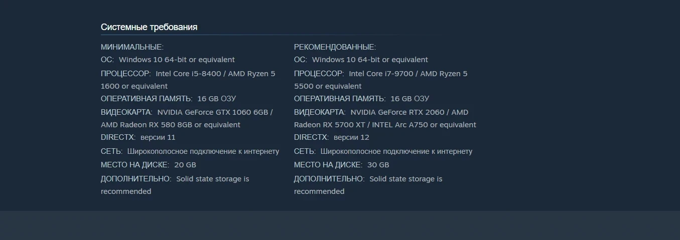 • видеокарта: NVIDIA GeForce GTX 1060 / AMD Radeon RX 580 или аналог;