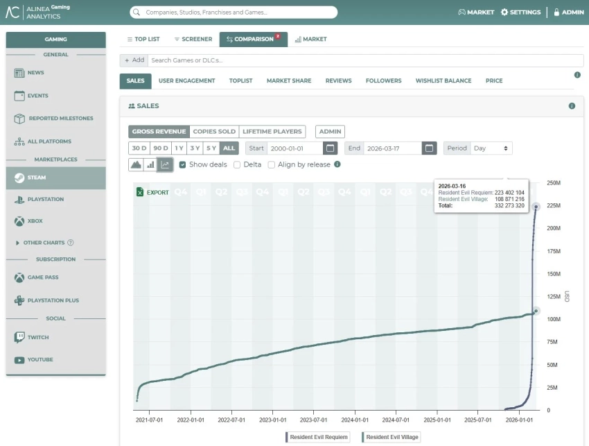 Обложка: скриншот Resident Evil RequiemResident Evil Requiem, по данным Alinea Analytics, за три недели заработала в Steam больше, чем Resident Evil Village за всё время существования на платформе. Всего новинка принесла Capcom 225 миллионов долларов США валового дохода в Steam.
